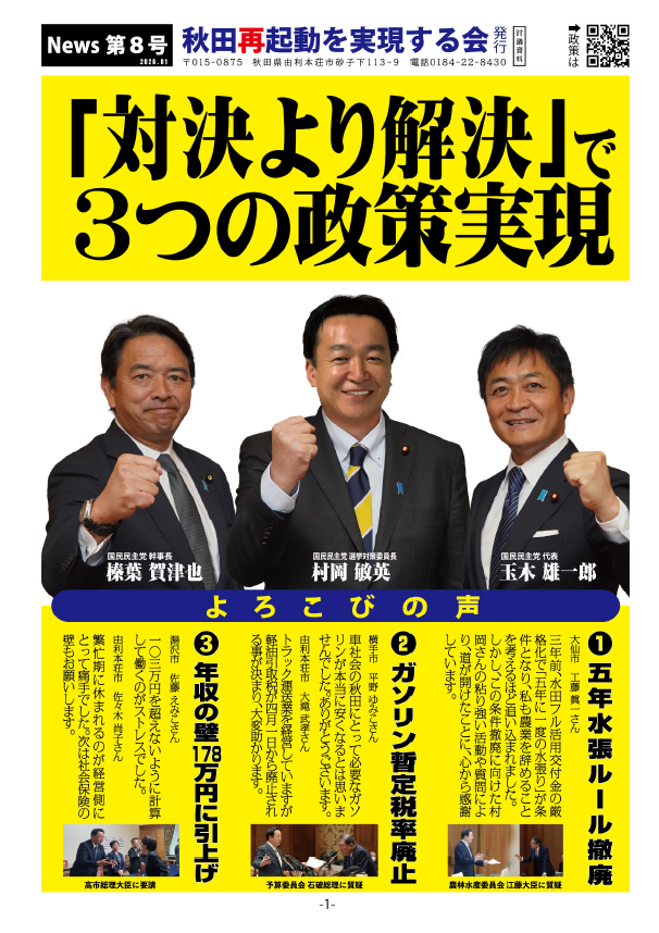 国民民主党村岡敏英は、水田農業のいわゆる「五年水張りルールの撤廃」や「30年続いた年収の壁の103万円から178万円への引き上げ」、「50年続いたガソリン暫定税率の廃止」などを訴えてまいりました。